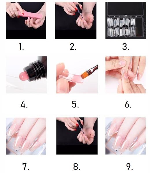 Pod umělý nehet nanes tenkou vrstvu poly gelu, který potom nalepíš na svůj nehet. Po sušení pod LED lampou umělý nehet jednoduše odlepíš.